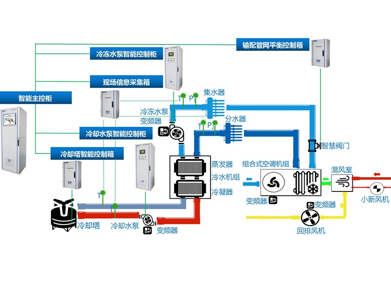 冷源系統(tǒng):實現(xiàn)對冷水主機,包括配套冷卻泵、冷凍泵、冷卻塔的群控。