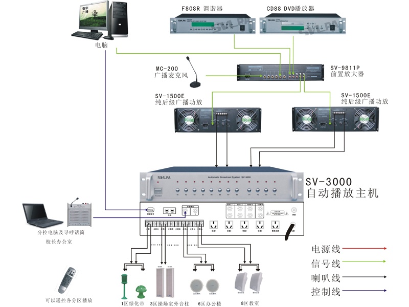 背景音響系統(tǒng)與消防廣播系統(tǒng)合二為一。系統(tǒng)平時(shí)可以播放音樂(lè),或者通過(guò)話筒發(fā)布公共消息,可以滿足對(duì)全部樓層同時(shí)進(jìn)行廣播的需要。在遇火警信號(hào)時(shí),則可以自動(dòng)轉(zhuǎn)為發(fā)布消防廣播。